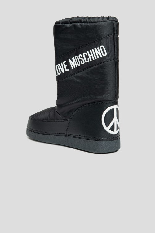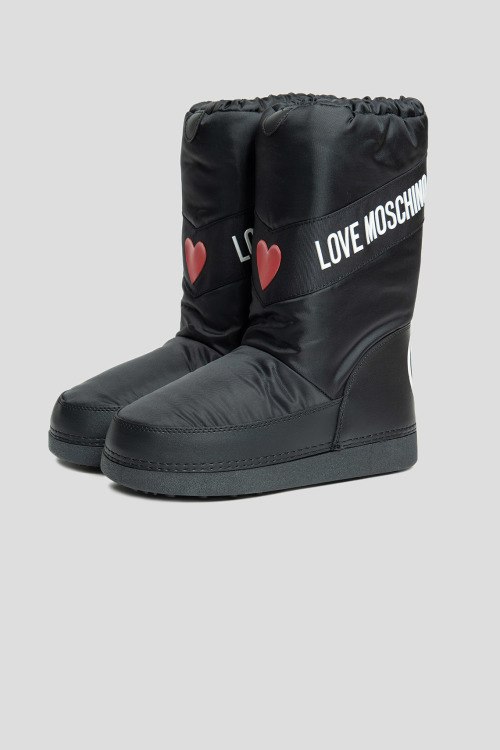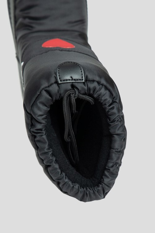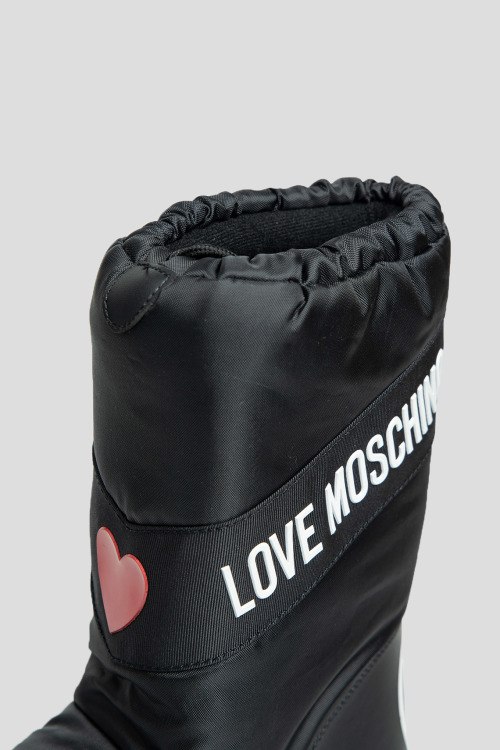 Детали: Женские черные текстильные мунбуты от Love Moschino (Лав Москино). Логотип сбоку, верх на затяжке, закругленный носок, кожаная отделка, антискользящая подошва. Высота голенища: 27 см, объем голенища: 34 см