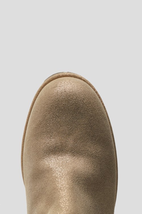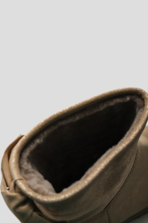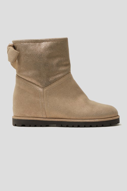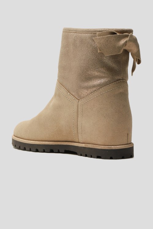 Женские золотистые ботинки из натуральной замши от Ballin (Баллин). Закругленный носок, рельефная подошва, модель без застежки, сзади декоративный бантик, утеплены натуральным мехом. Измерения: высота голенища: 15 см