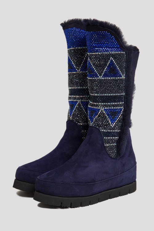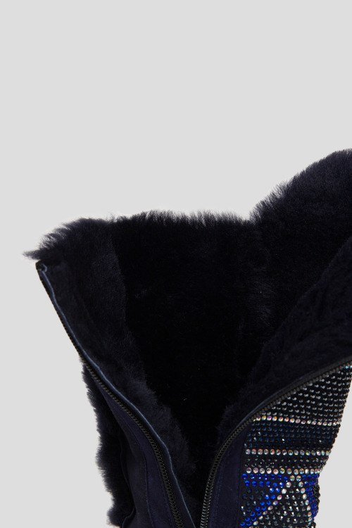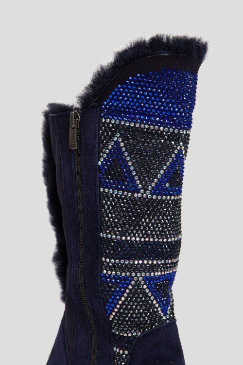 Детали: Женские темно-синие замшевые сапоги на меху от Camuzares (Камузарес). Декор черными и синими стразами, застежка-молния сбоку, меховая отделка, закругленный носок, скрытая танкетка, внутри на меху. Замеры: высота каблука (танкетка скрытая): 6 см, высота голенища: 30 см, ширина голенища (обхват): 35 см