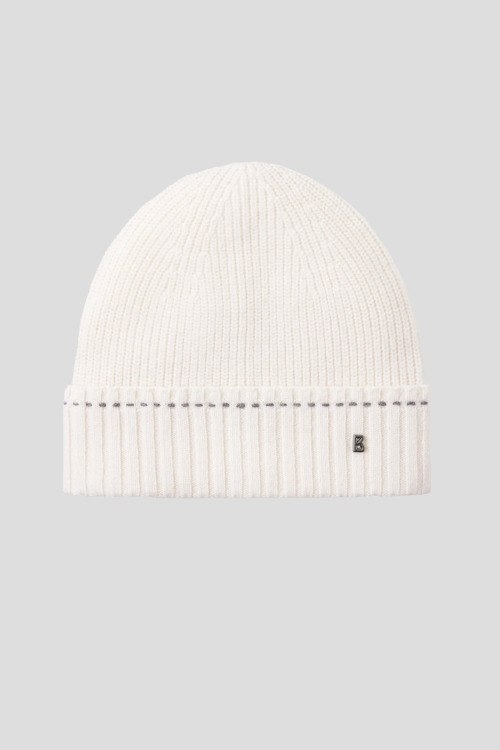 Детали: Женская белая шерстяная шапка бини Moulan от Bogner (Богнер). Классическая вязка, значок с логотипом, широкий отворот
