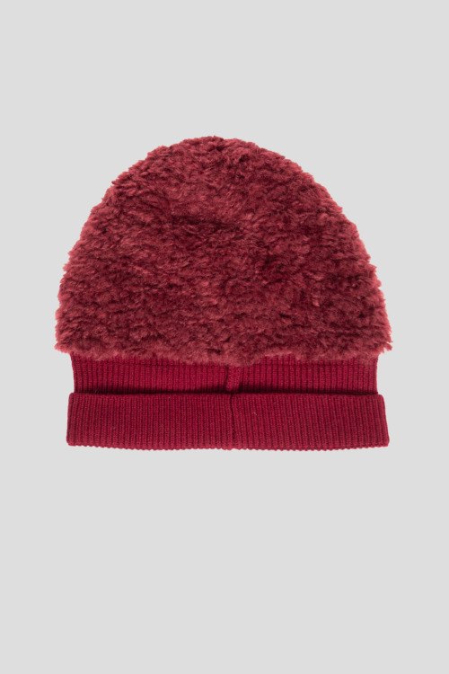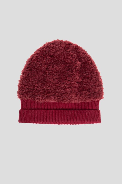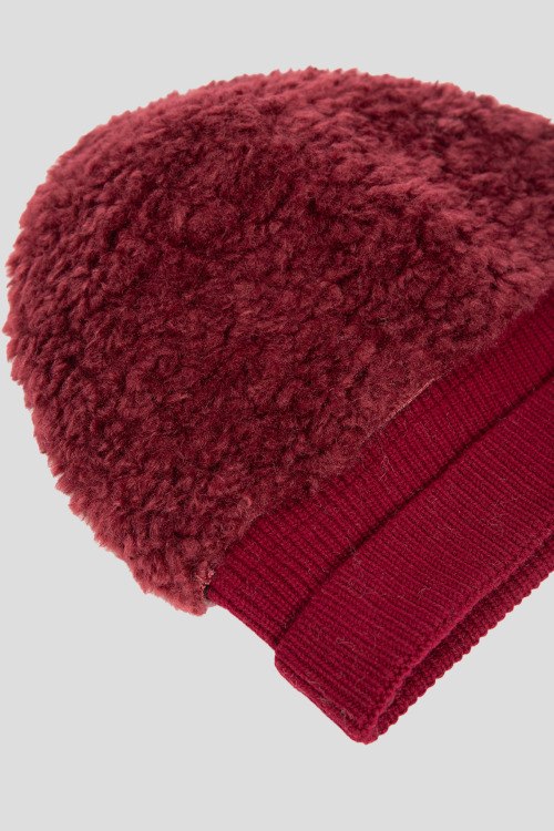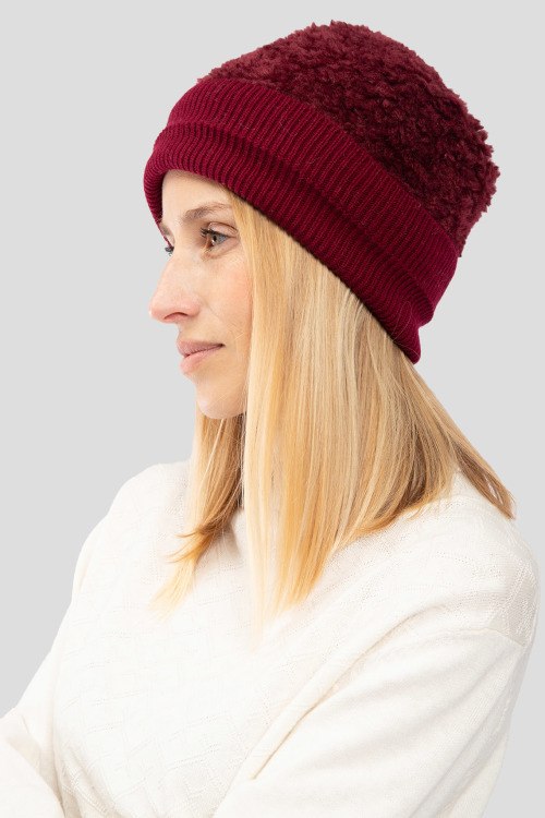 Детали: Женская бордовая шапка бини от Diego M (Диего М). Модель из шерсти и экомеха, классическая вязка, отворот