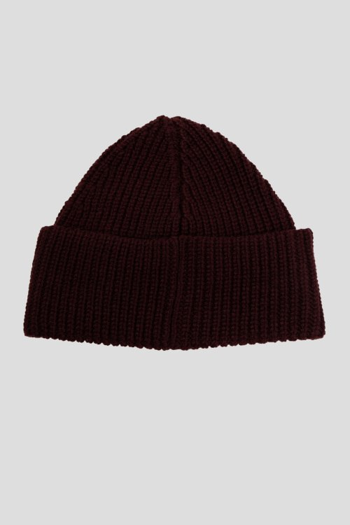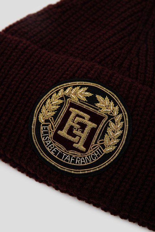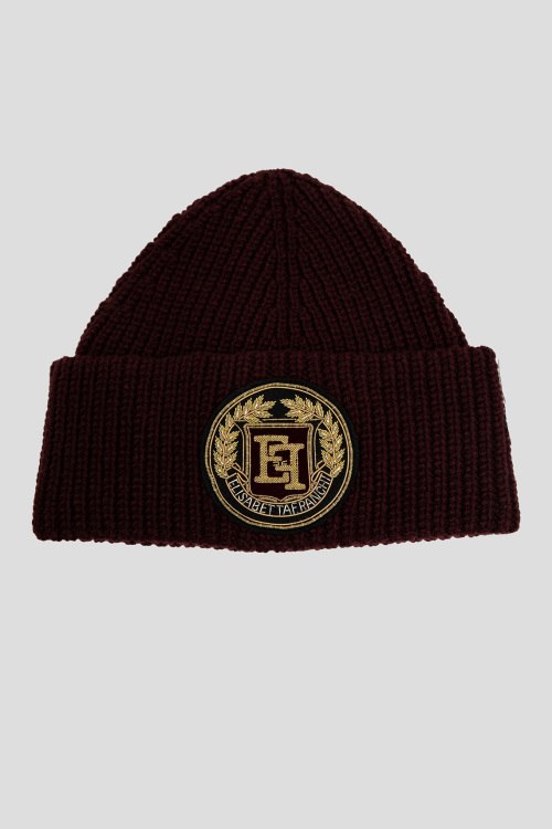 Детали: Женская бордовая шапка бини из шерсти и акрила от Elisabetta Franchi (Елизабетта Франчи). Классическая вязка, нашивка с логотипом, широкий отворот