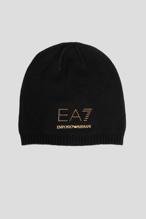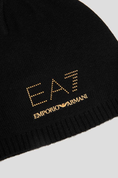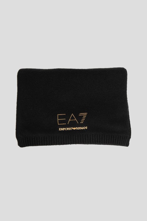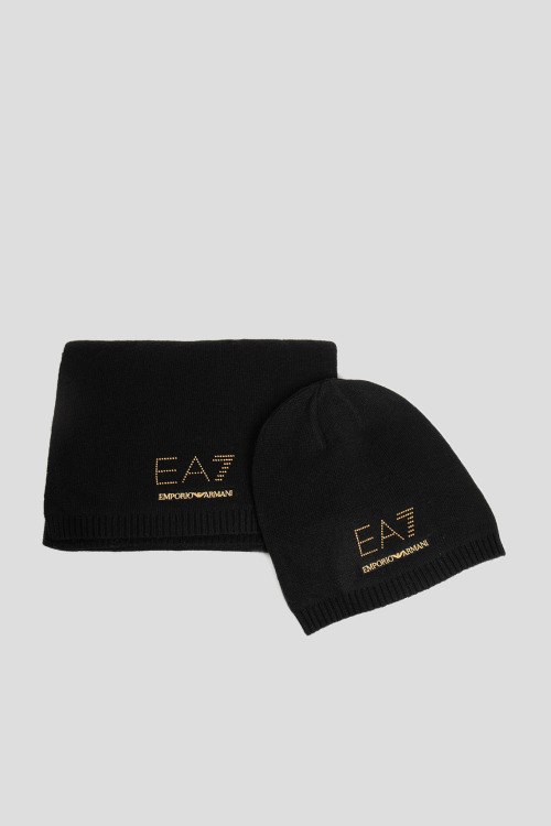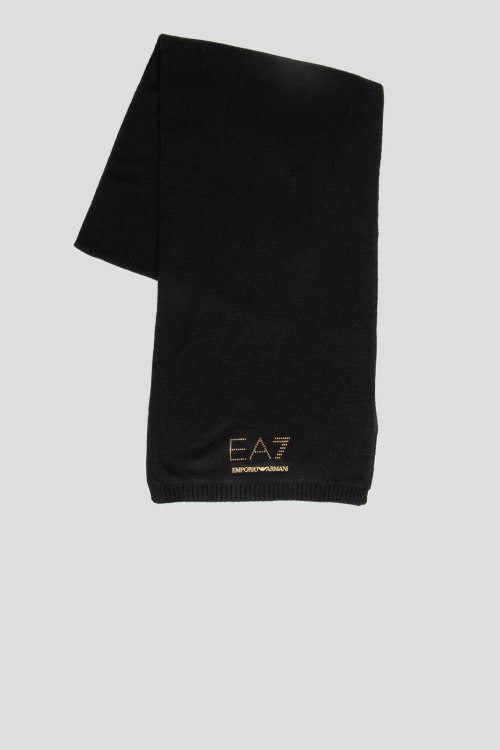 Детали: Женский черный комплект от EA7 Emporio Armani (ЕА7 Эмпорио Армани). Шапка бини и шарф классической вязки, логотип из страз