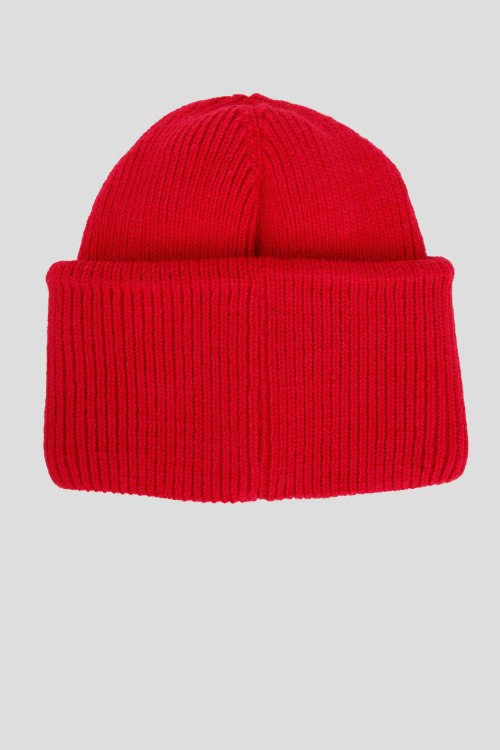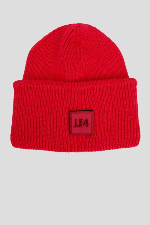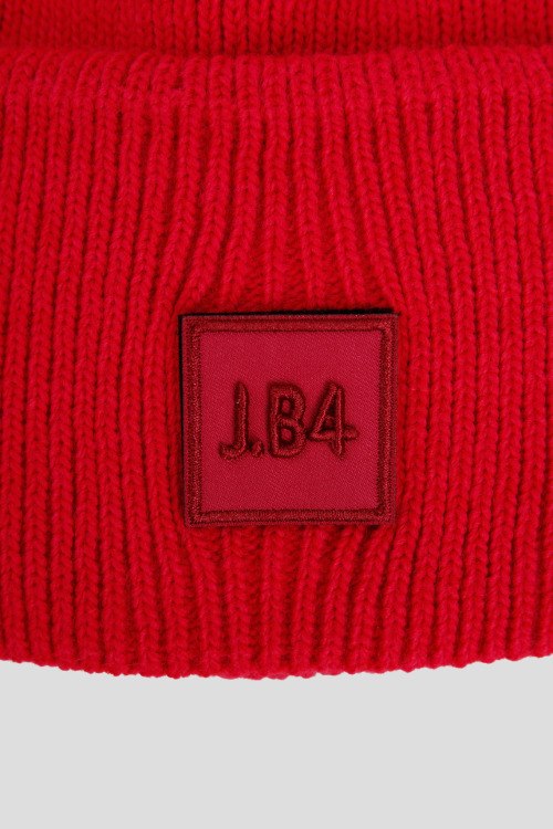 Детали: Женская красная шапка из акрила от J.B4 Just Before (Джаст Бифо). Машинная вязка, широкий отворот, патч-лого спереди,