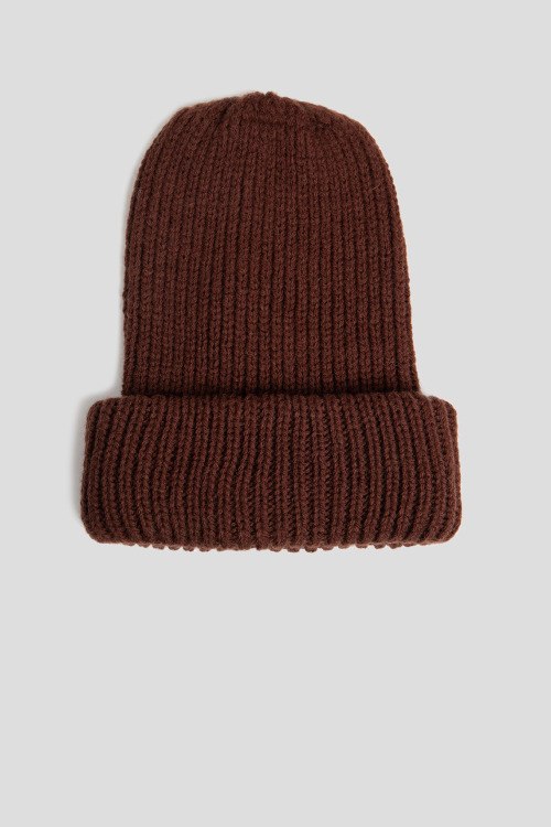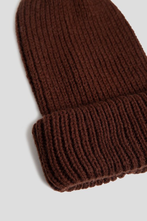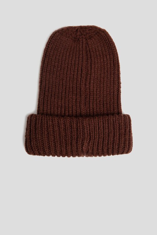 Детали: Женская темно-коричневая шапка бини из шерсти и акрила от Kontatto (Контатто). Комбинация материалов, классическая вязка, широкий отворот