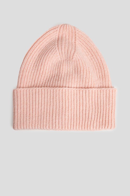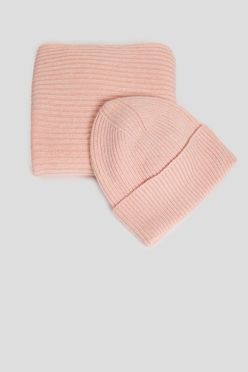 Женский персиковый комплект из шерсти и вискозы от Cashmere (Кашемир). Модель с примесью шерсти, шапка бини и шарф классической вязки. Размеры: длина 205 см, ширина 55 см