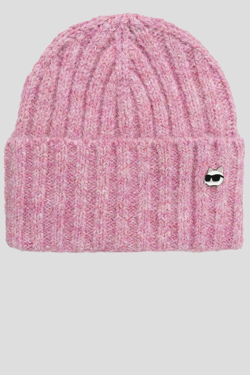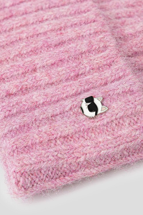 Детали: Женская розовая шапка бини Ikon Pin от Karl Lagerfeld (Карл Лагерфельд). Крупная вязка, нашивка с логотипом, широкий отворот
