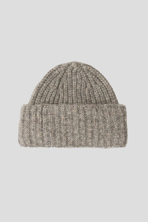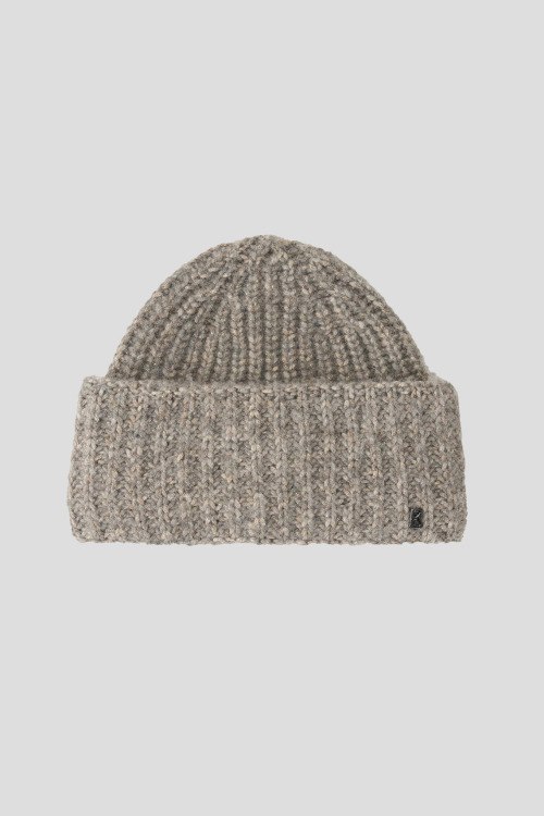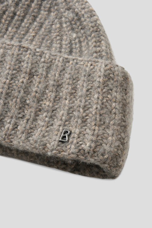 Детали: Женская серая шапка бини из хлопка и альпаки Sparky от Bogner (Богнер). Крупная вязка, значок логотипа, широкий отворот