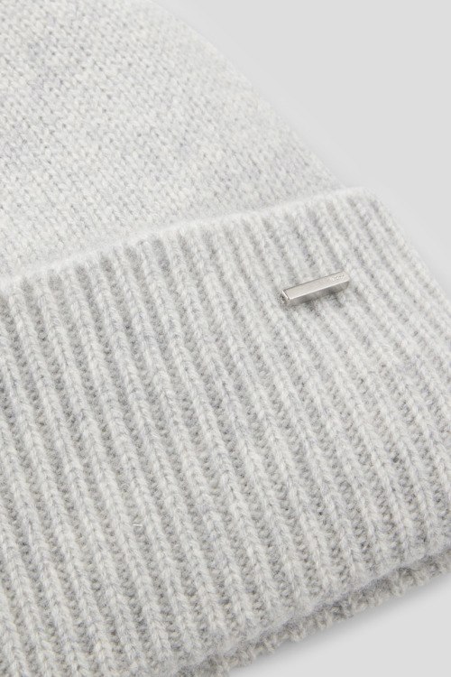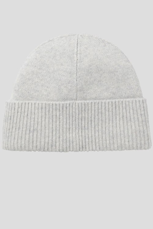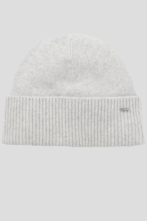 Детали: Женская серая шапка из кашемира от Hugo Boss (Хуго Босс). Модель бини, широкий отворот, металлический логотип бренда