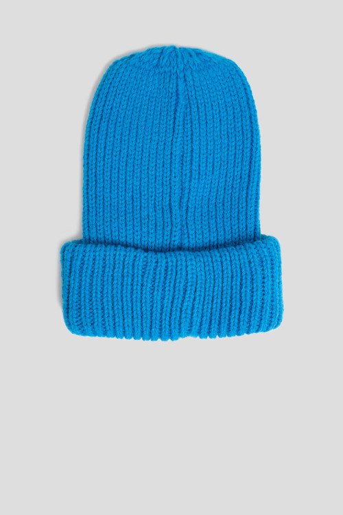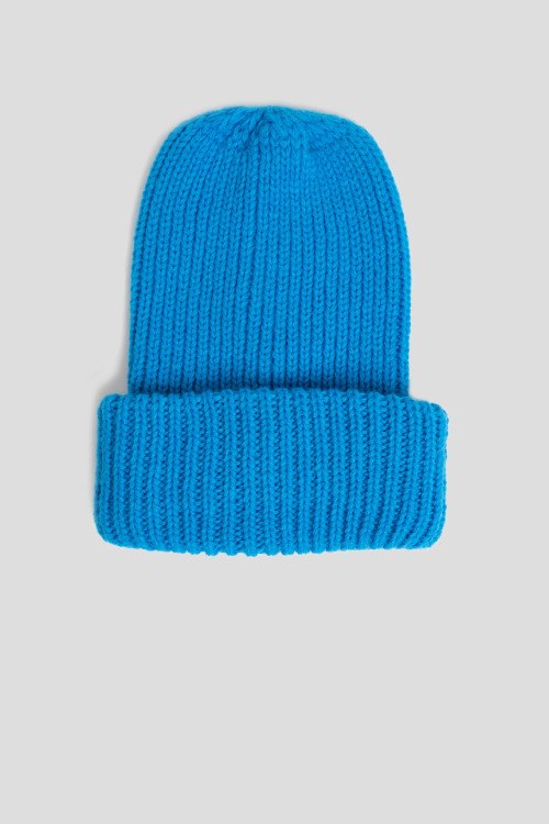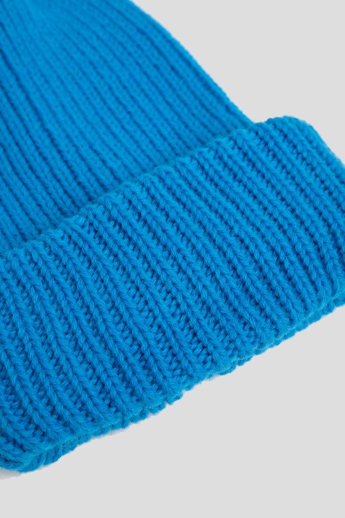 Детали: Женская синяя шапка бини из шерсти и акрила от Kontatto (Контатто). Комбинация материалов, классическая вязка, широкий отворот