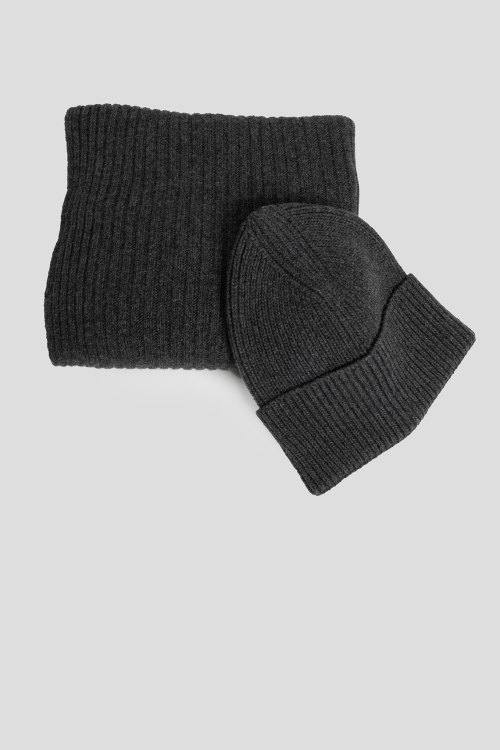 Женский темно-серый комплект из шерсти и вискозы от Cashmere (Кашемир). Модель с примесью шерсти, шапка бини и шарф классической вязки. Размеры: длина 205 см, ширина 55 см