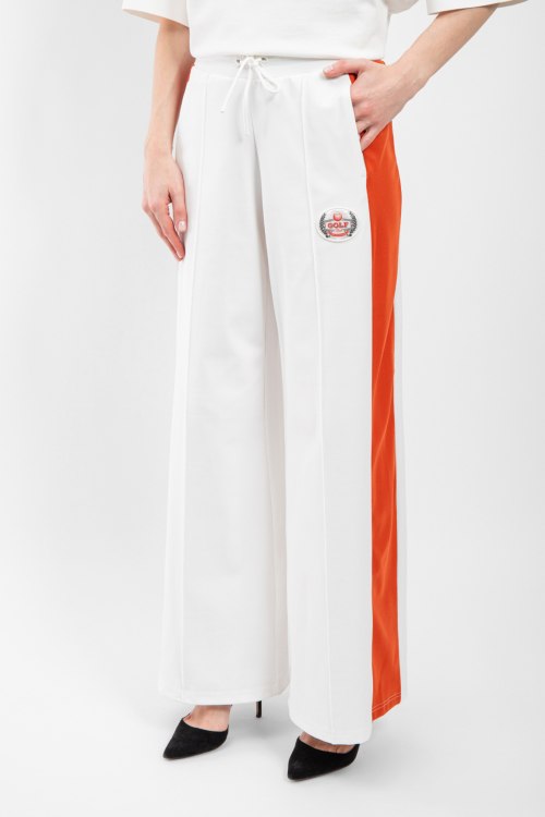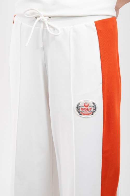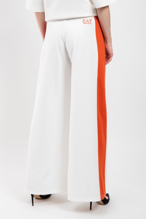 Женские белые брюки из полиэстера и эластана от EA7 Emporio Armani (ЕА7 Эмпорио Армани). Классическая длина, высокая посадка, эластичная резинка на поясе с кулиской, дизайн с контрастными лампасами, патч-лого.
