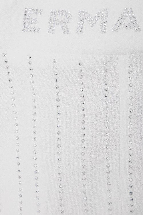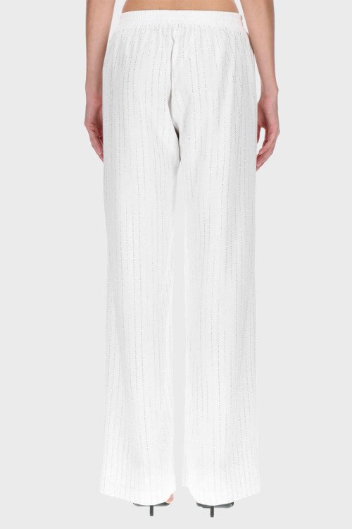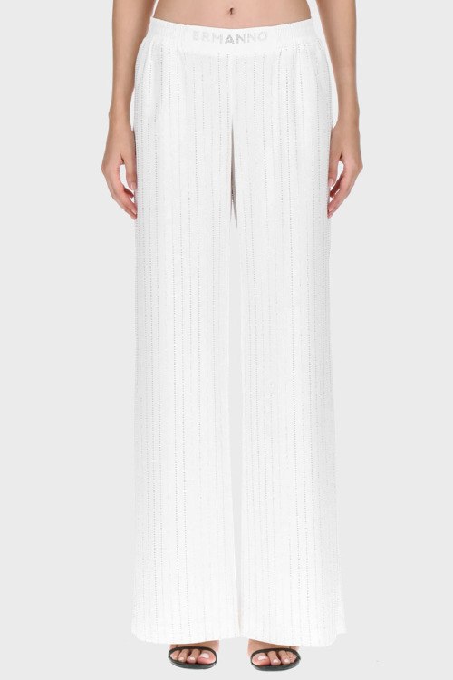 Детали: Женские белые брюки от Ermanno Ermanno Scervino (Эрманно Эрманно Шервино). Эластичный пояс с логотипом из кристаллов, тонкие полоски из кристаллов по всей поверхности, боковые карманы, широкий крой, полная длина