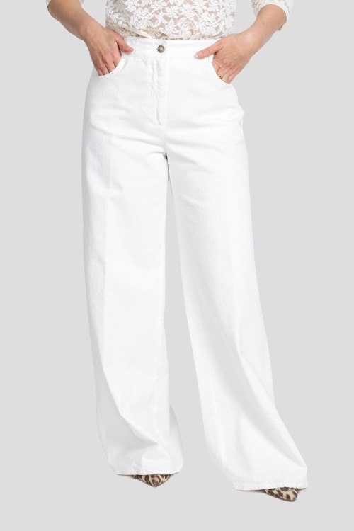 Детали: Женские белые брюки-палаццо из хлопкового микса от Peserico (Пезерико). Классическая длина, высокая посадка, застежка на молнию и пуговицу, четыре кармана, петли в поясе для ремня, расклешенная модель, патч-лого