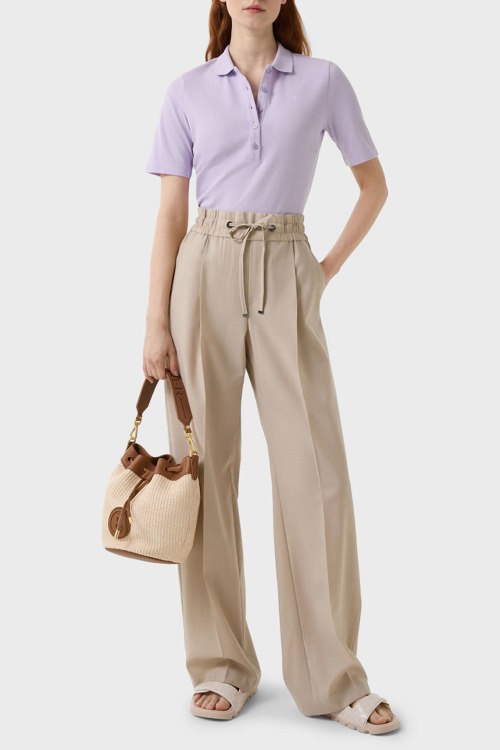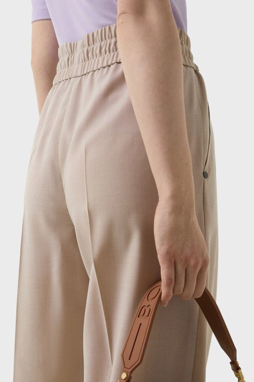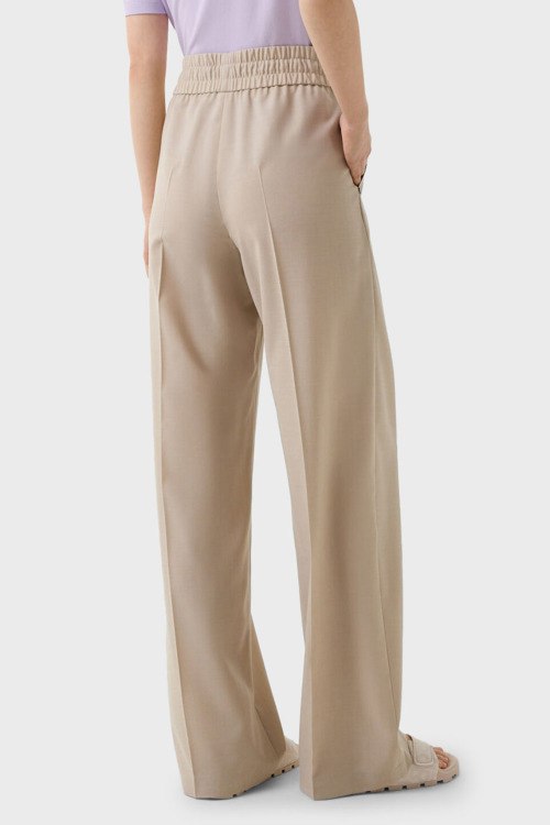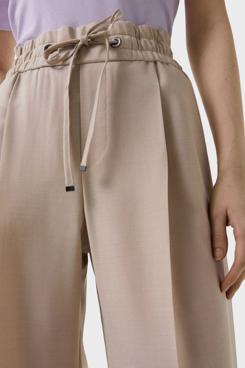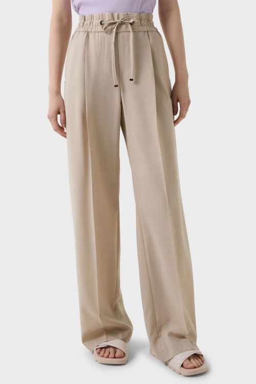 Детали: Женские бежевые брюки из тонкой шерсти Ella от Bogner (Богнер). Высокая посадка с эластичным поясом на завязках, дизайн со стрелками, боковые карманы, широкий крой, полная длина
