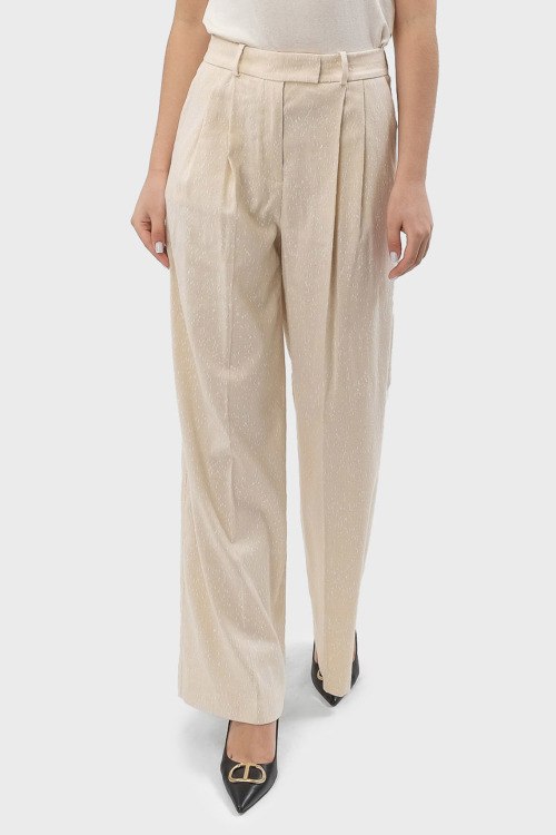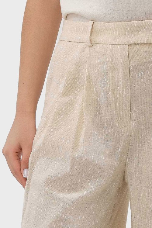 Детали: Женские бежевые брюки из хлопкового микса от Hugo Boss (Хуго Босс). Классическая длина, расклешенная модель от бедра, высокая посадка, застежка на молнию и пуговицу, петли в поясе для ремня