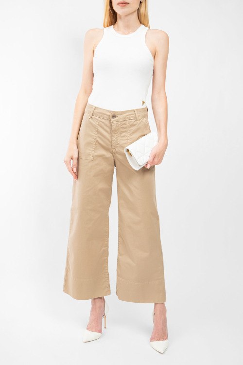 Женские бежевые хлопковые кюлоты от J.B4 Just Before (Джаст Бифо). Боковые и задние карманы, пояс с петлями для ремня, нашивка с логотипом сзади на поясе, широкий крой, укороченная длина.