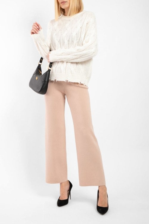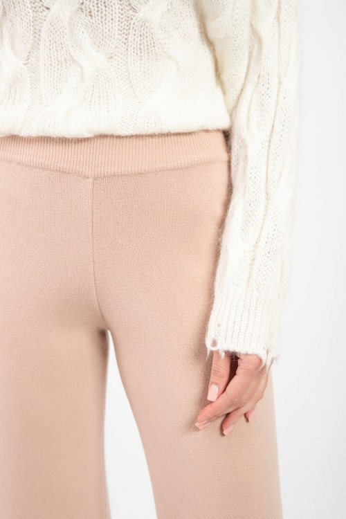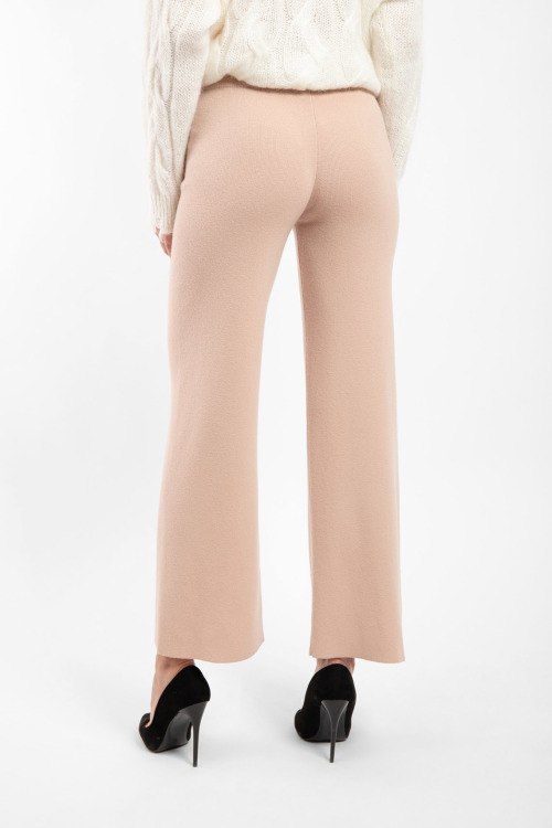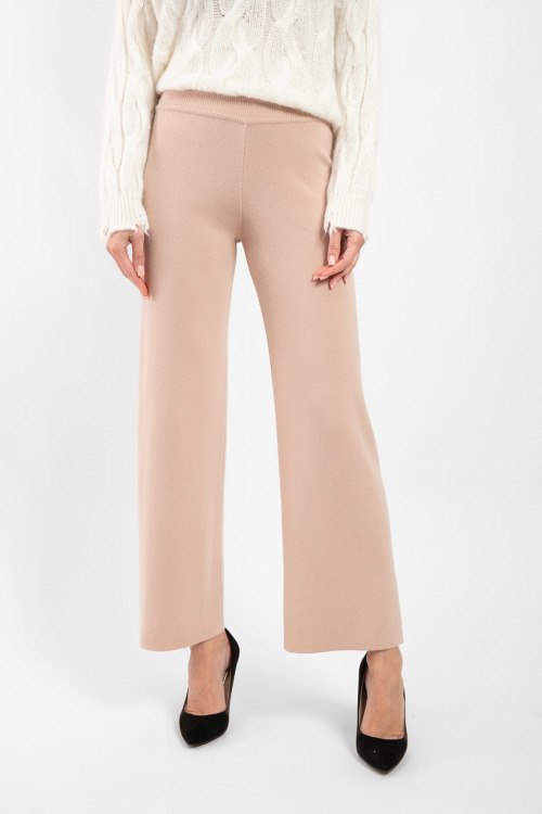 Женские пудровые брюки из шерстяного микса от Kontatto (Контатто). Высокая посадка, эластичная резинка на поясе, расклешенная модель от бедра.