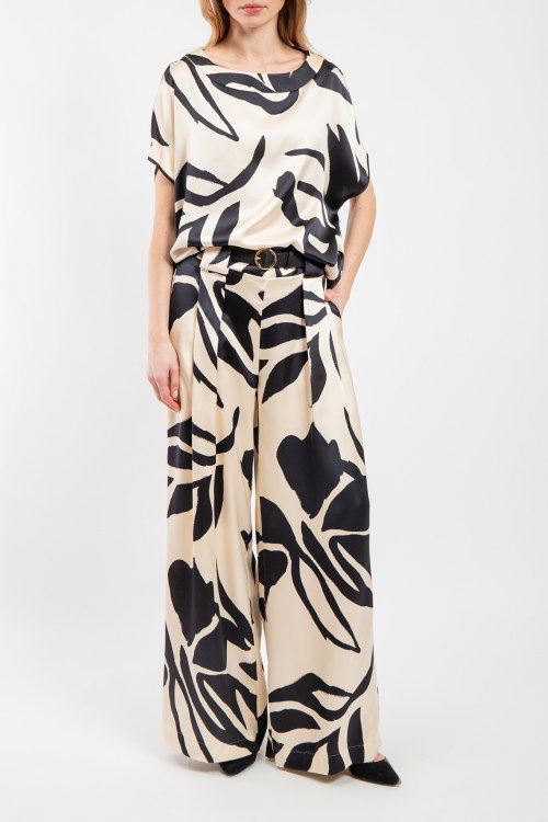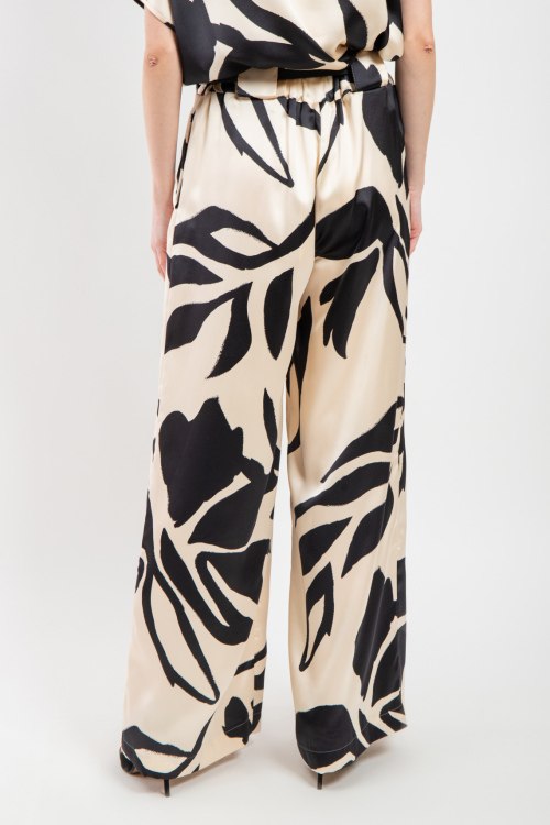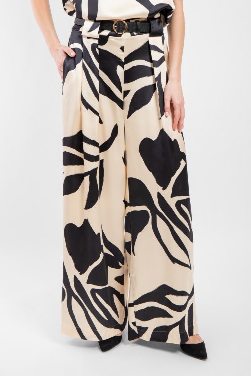 Женские бежевые брюки-палаццо из полиэстера от Kocca (Кокка). Классическая длина, расклешенная модель, высокая посадка, эластичная резинка на поясе, прорезные карманы, дизайн с узором по всей поверхности изделия.