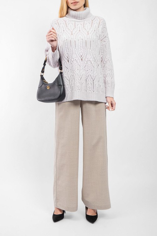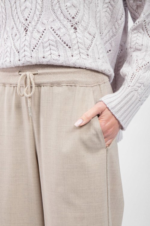 Женские бежевые шерстяные брюки от Panicale Cashmere (Паникале Кашемир). Эластичный пояс на завязках, боковые карманы, широкий крой, полная длина.