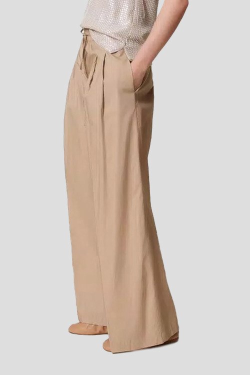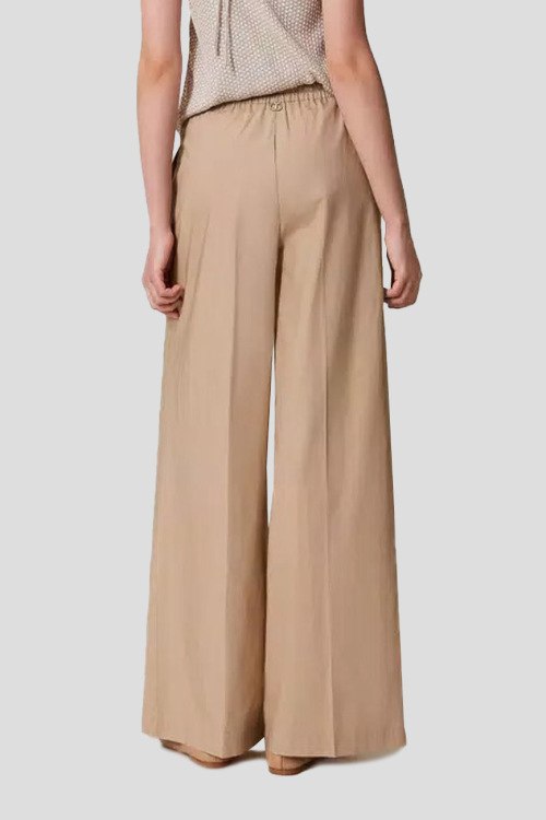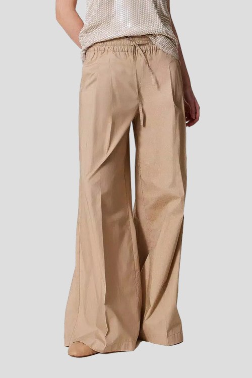 Детали: Женские бежевые хлопковые брюки-палаццо от TWINSET (Твинсет). Дизайн со стрелками, эластичный пояс на завязках, боковые карманы, широкий крой, полная длина