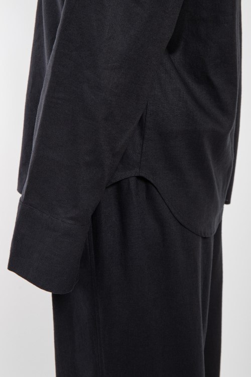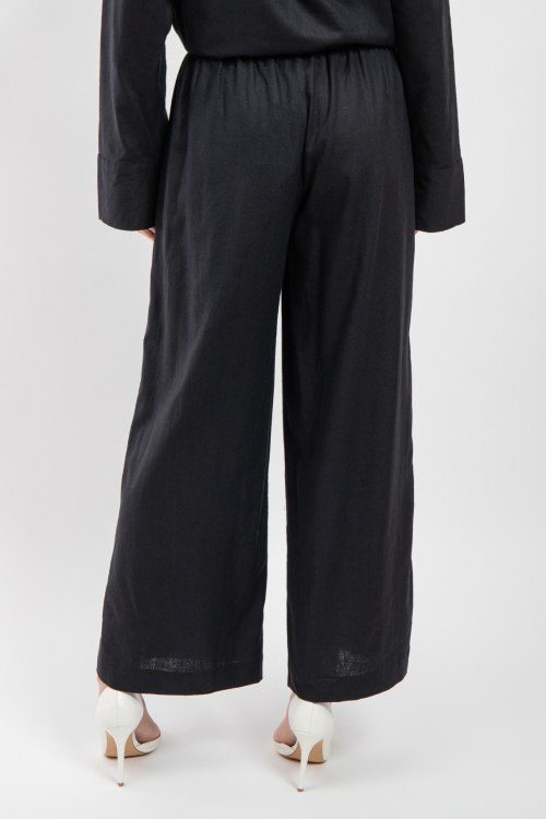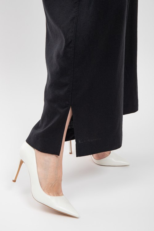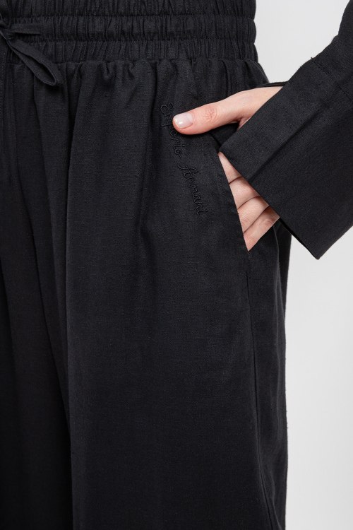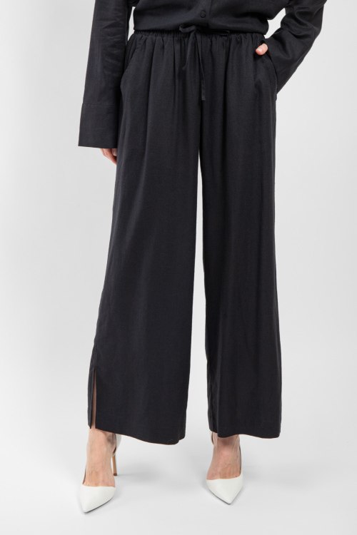 Женские черные брюки из льна и вискозы от EA7 Emporio Armani (ЕА7 Эмпорио Армани). Классическая длина, широкая модель, эластичная резинка на поясе с кулиской, прорезные карманы, боковые разрезы на манжетах.