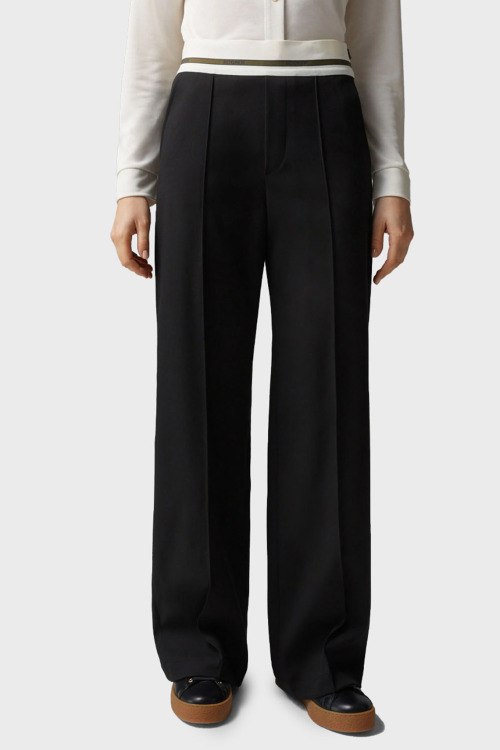 Детали: Женские черные брюки из хлопка и вискозы Marlene от Bogner (Богнер). Модель с примесью шерсти, контрастный пояс, боковые карманы, застежка-молния сбоку, широкий крой, полная длина