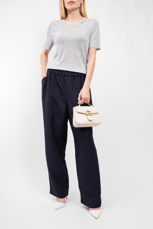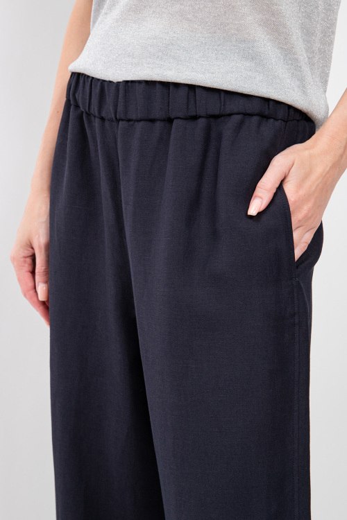Женские черные брюки из вискозы и льна от Fabiana Filippi (Фабиана Филиппи). Эластичный пояс, боковые карманы, широкий крой, полная длина. Замеры для размера 44: Длина: 109 см, ширина штанины вверху: 35 см, ширина по поясу: 43 см, ширина по бёдрам: 52 см, высота сидения: 38 см.