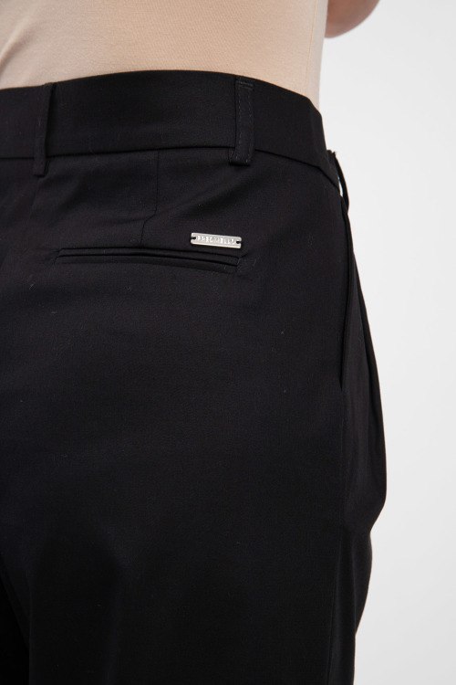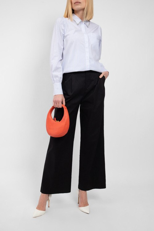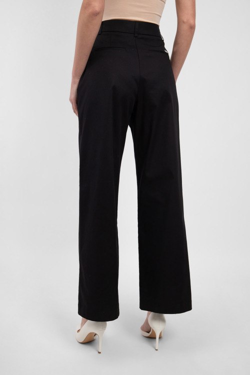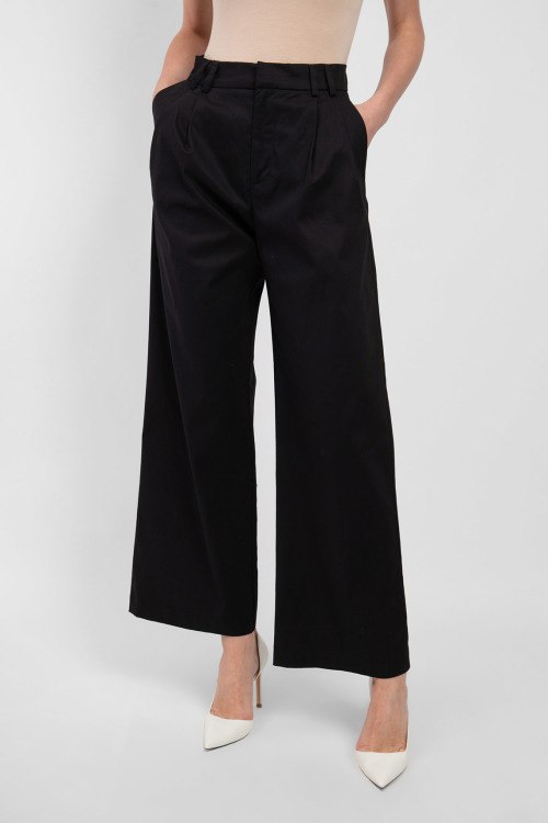 Женские черные брюки-палаццо из хлопкового микса от Fred Mello (Фред Мелло). Классическая длина, высокая посадка, застежка на молнию и пуговицу, расклешенная модель, металлический логотип бренда, петли в поясе для ремня.