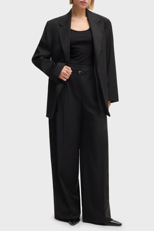 Детали: Женские черные шерстяные брюки-палаццо от Hugo Boss (Хуго Босс). Дизайн со стрелками, в талии с тонким поясом, боковые карманы, широкий крой, полная длина