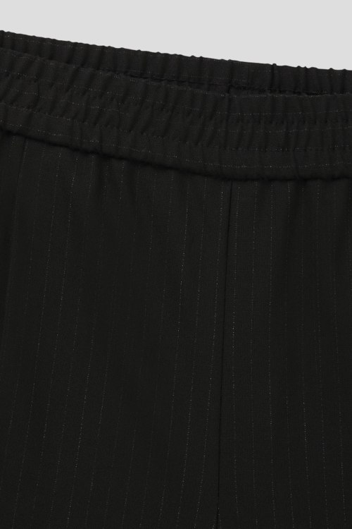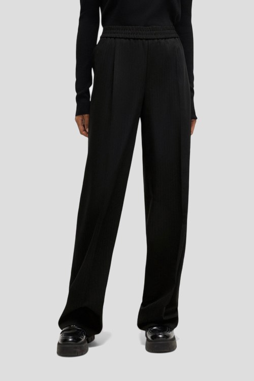 Детали: Женские черные брюки Garos_ALL из переработанного полиэстера и вискозы от Hugo by Hugo Boss (Хуго бай Хуго Босс). Классическая длина, эластичная резинка на поясе, расклешенная модель, прорезные карманы, модель декорирована мелкой полоской