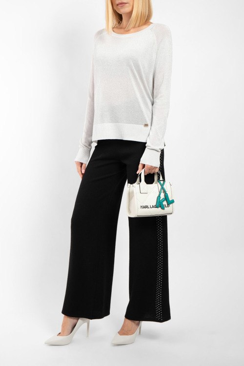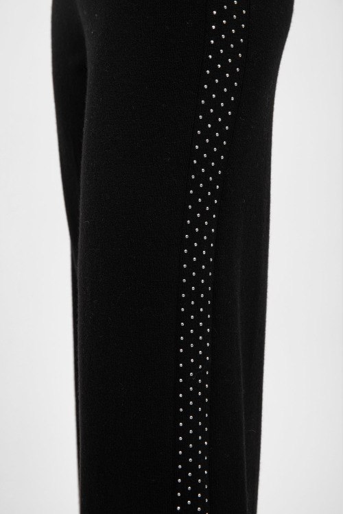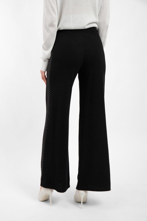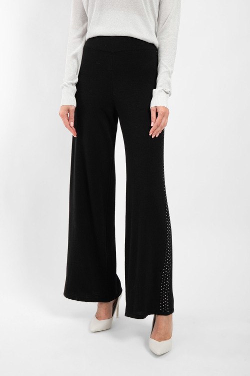 Женские черные брюки из шерстяного микса от Kontatto (Контатто). Высокая посадка, эластичная резинка, расклешенная модель от бедра, классическая длина, по бокам декорированы кристаллами. Измерения для размера UNI: длина брюк: 116 см, ширина по талии: 35 см, ширина по бедрам: 39 см, высота сидения 37 см, ширина штанины вверху: 30 см.