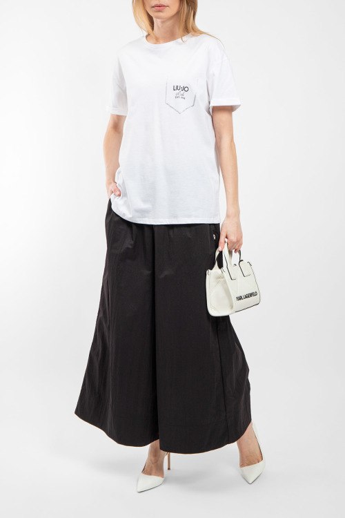 Женские черные брюки из полиэстера и полиамида от Liu Jo (Лиу Джо). Классическая длина, эластическая резинка на поясе, прорезные карманы, логотип бренда, расклешенная модель.