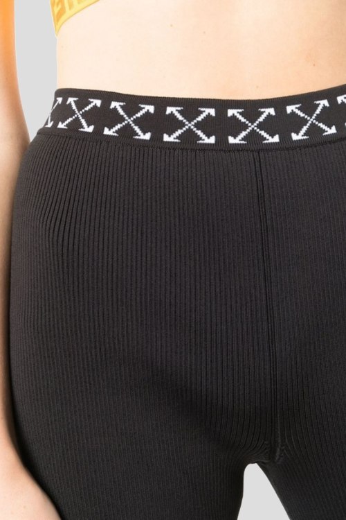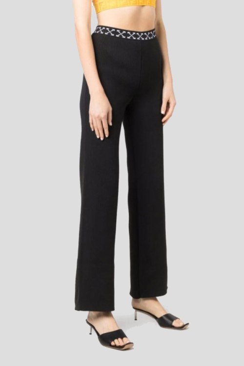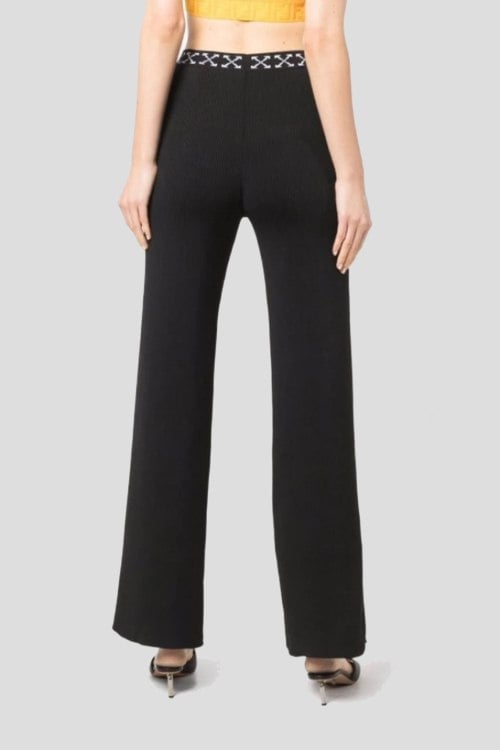 Детали: Женские черные брюки из полиэстера и полиамида от Off-White (Офф-Вайт). Классическая длина, высокая посадка, эластичная резинка на поясе с логотип Arrows, расклешенная модель