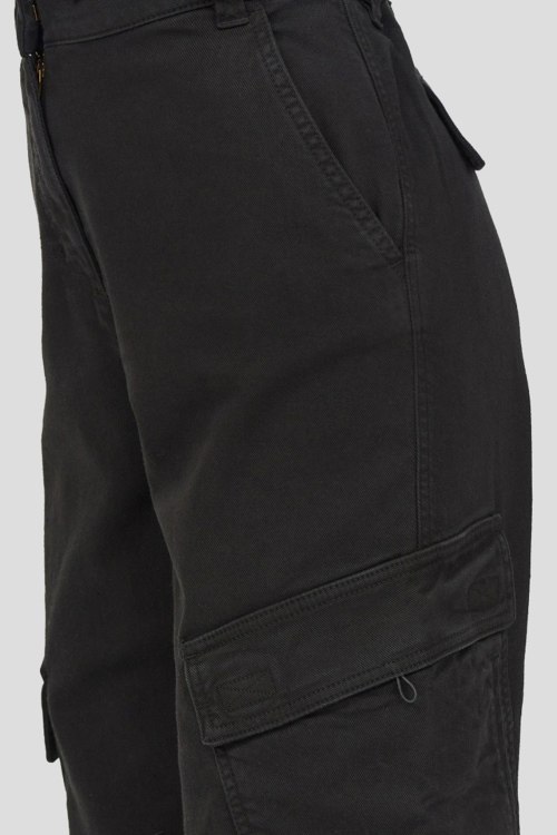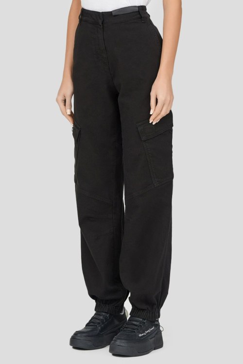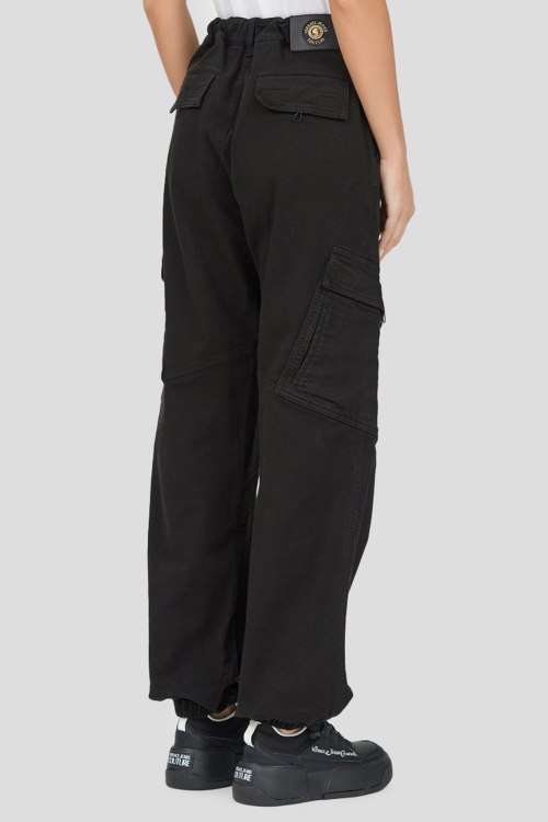 Женские черные брюки из хлопкового микса от Versace Jeans Couture (Версаче Джинс Кутюр). Высокая посадка, застежка на молнию и пуговицу, классическая длина, прорезные карманы, два боковых кармана с клапаном, эластичная резинка на манжетах, петли в поясе для ремня, патч-лого