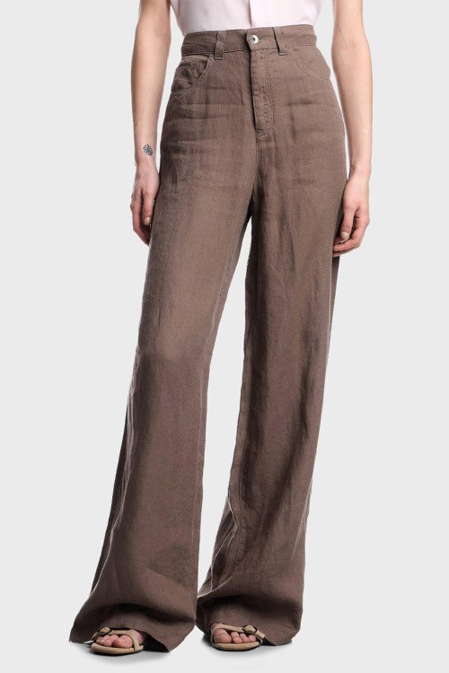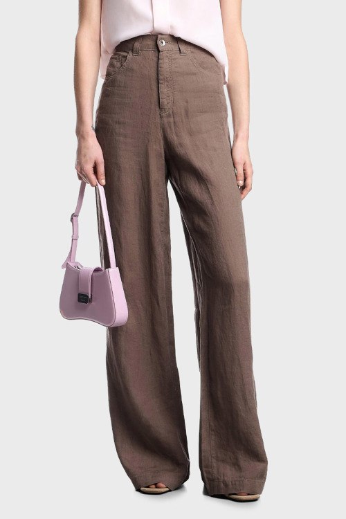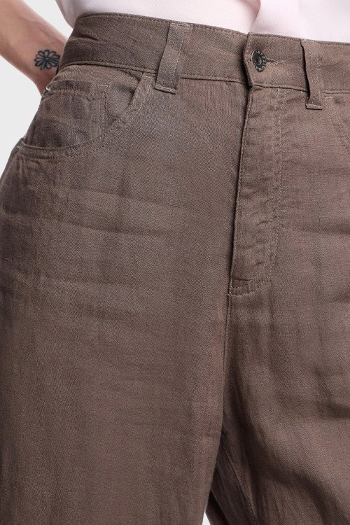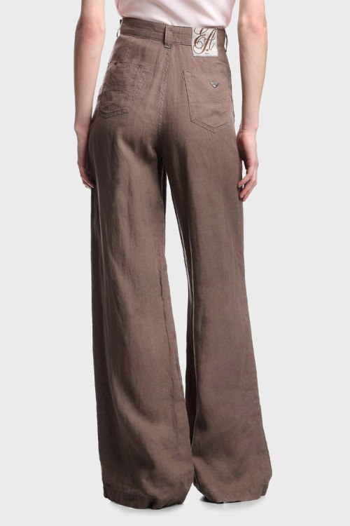 Детали: Женские коричневые льняные брюки от Emporio Armani (Эмпорио Армани). Классическая длина, высокая посадка, застежка на молнию и пуговицу, четыре кармана, петли в поясе для ремня, патч-лого