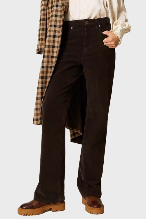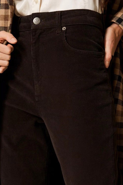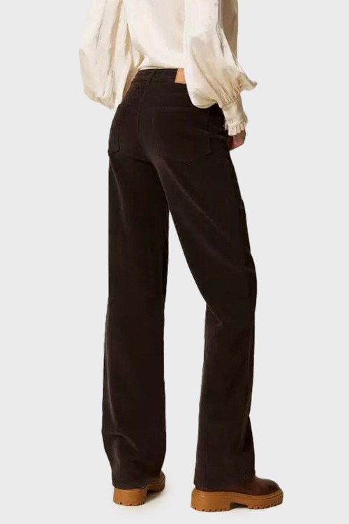 Детали: Женские темно-коричневые вельветовые брюки от TWINSET (Твинсет). Пяти-карманная модель, пояс с петлями для ремня, нашивка с логотипом сзади на поясе, полная длина