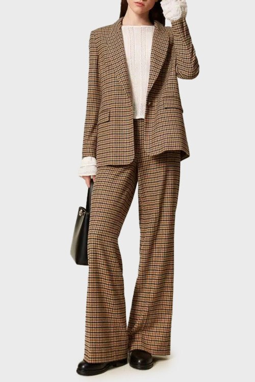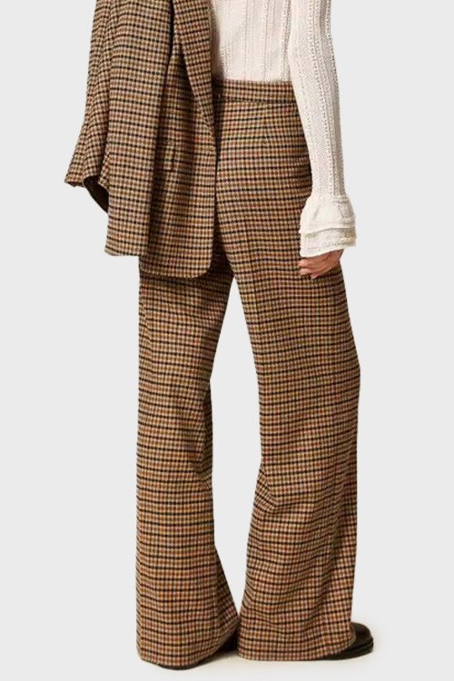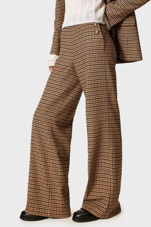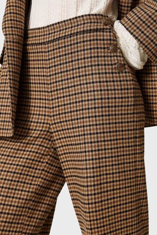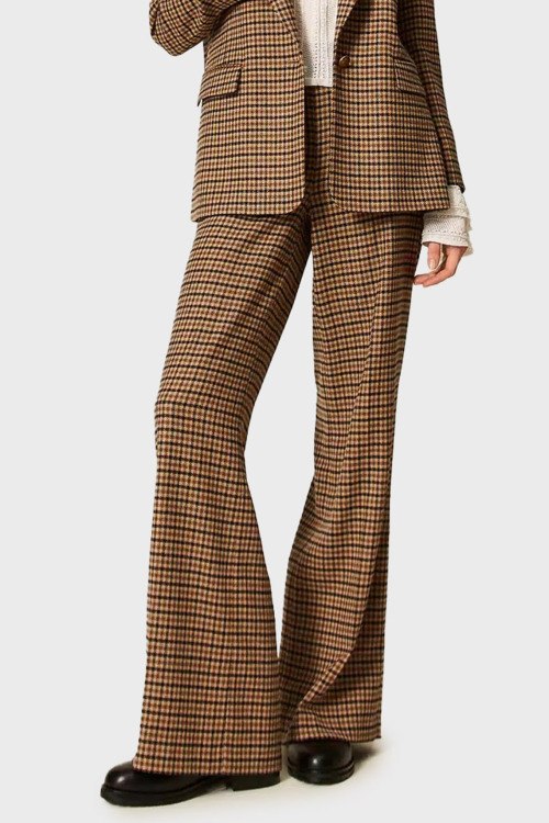 Детали: Женские коричневые брюки-клеш с примесью шерсти от TWINSET (Твинсет). Узор в клетку по всей поверхности, застежка на три пуговицы сбоку, расклешенный крой, полная длина