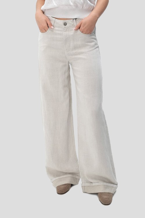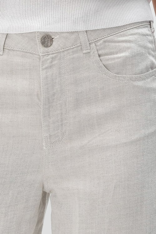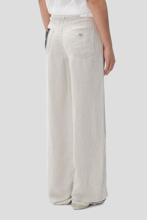 Детали: Женские брюки молочного оттенка из хлопка и льна от Emporio Armani (Эмпорио Армани). Расклешенная модель, средняя посадка, застежка на молнию и пуговицу, четыре кармана, петли в поясе для ремня