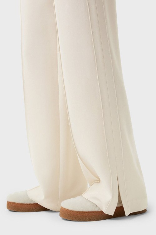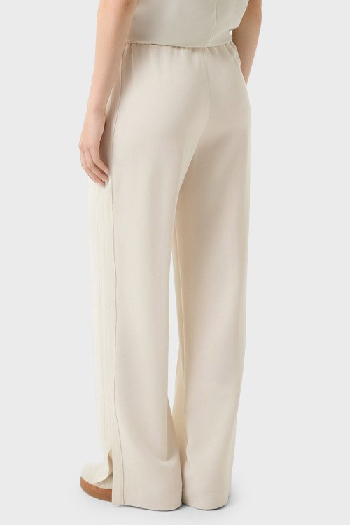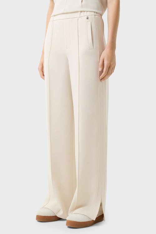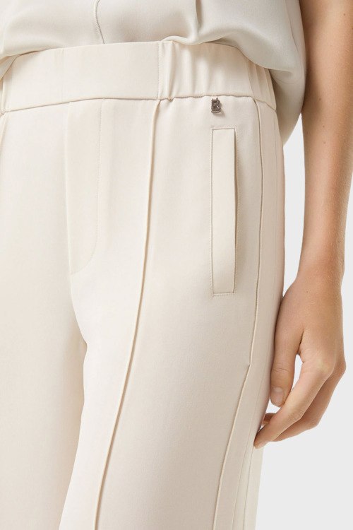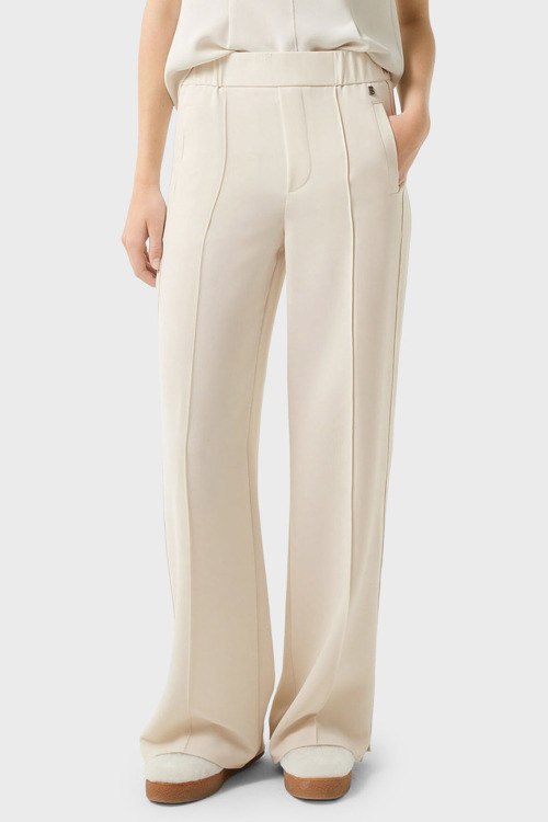 Детали: Женские брюки молочного оттенка из гладкой ткани Suzy от Bogner (Богнер). Эластичный пояс, значок с логотипом, боковые карманы, разрезы по бокам, полная длина