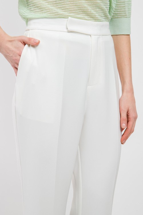 Женские брюки молочного оттенка из полиэстера и эластана от Isabelle Blanche (Изабель Бланш). Классическая длина, высокая посадка, застежка на молнию и пуговицу, расклешенная модель, прорезные карманы.