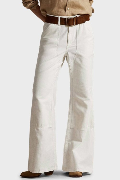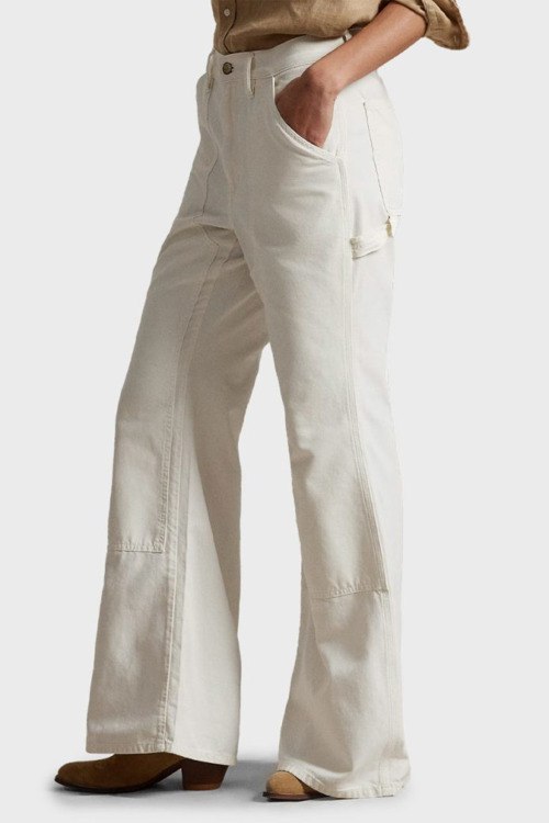 Детали: Женские джинсы молочного оттенка из хлопка от Polo Ralph Lauren (Поло Ральф Лорен). Классическая длина, высокая посадка, застежка на молнию и пуговицу, пять карманов, петли в поясе для ремня, патч-лого, расклешенная модель