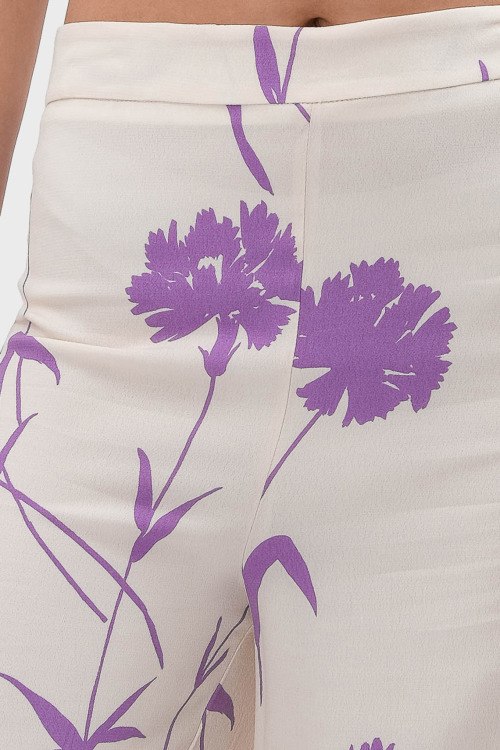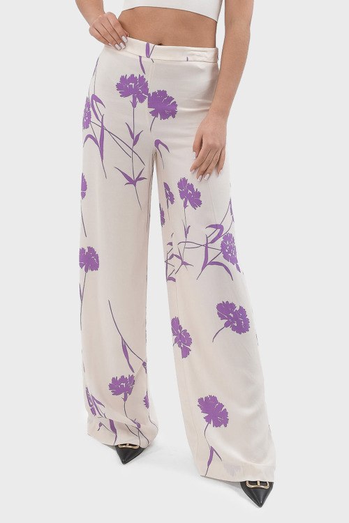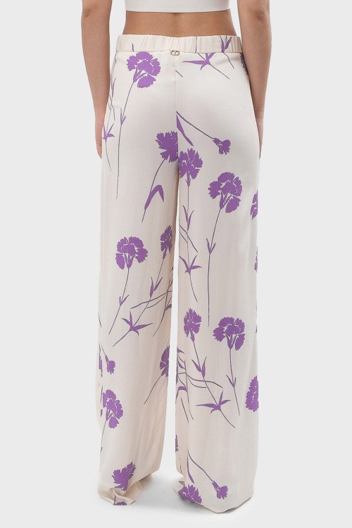 Детали: Женские брюки палаццо молочного оттенка из вискозы от TWINSET (Твинсет). Класссическая длина, расклешенная модель, высокая посадка, сбоку застежка на молнию, эластичная резинка в поясе, цветочный принт по всей поверхности изделия