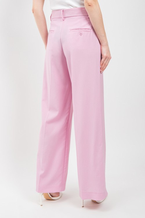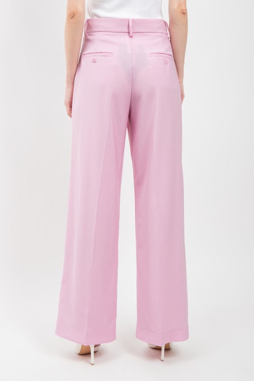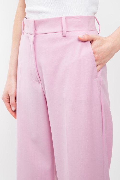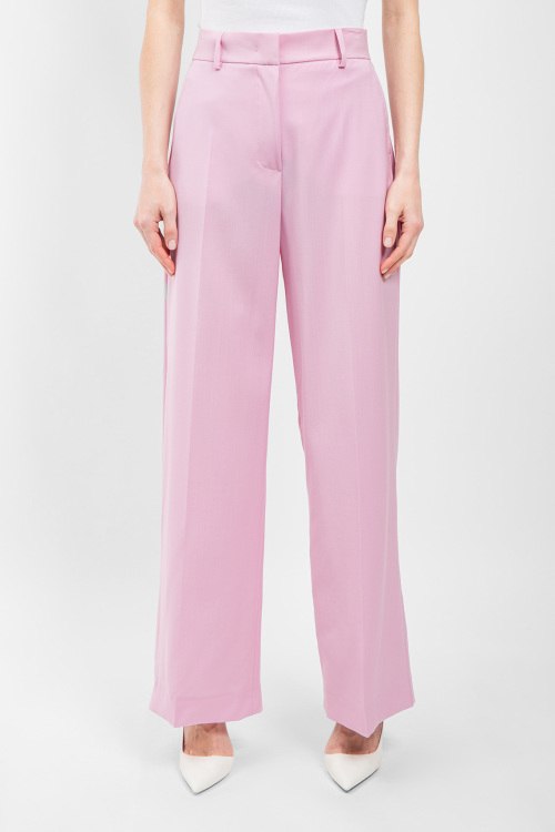 Женские розовые шерстяные брюки Visivo от Max Mara Weekend (Макс Мара Викенд). Классическая длина, расклешенная модель, высокая посадка, застежка на молнию и пуговицу, петли в поясе для ремня.