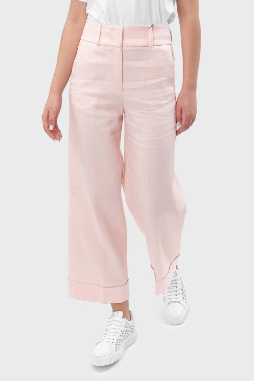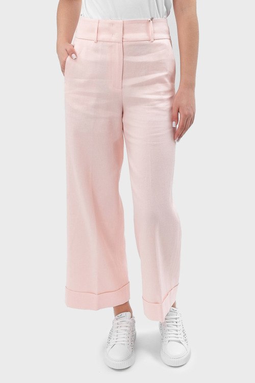 Детали: Женские пудровые брюки из льняного микса от Peserico (Пезерико). Укороченная модель, расклешенная модель, высокая посадка, застежка на молнию и пуговицу, прорезные карманы, петли в поясе для ремня