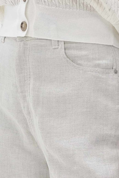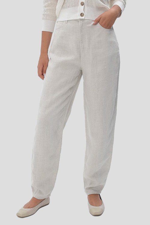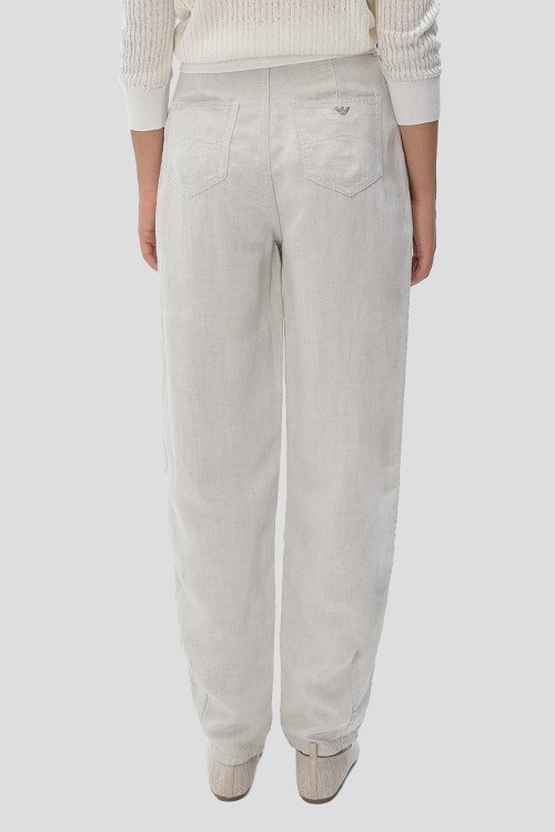 Детали: Женские светло-серые брюки из лиоцелла и льна от Emporio Armani (Эмпорио Армани). Пяти-карманная модель, пояс с петлями для ремня, значок логотипа на заднем кармане, полная длина