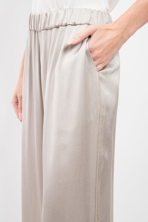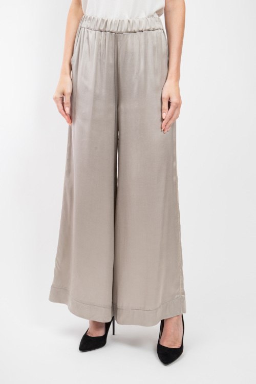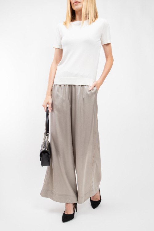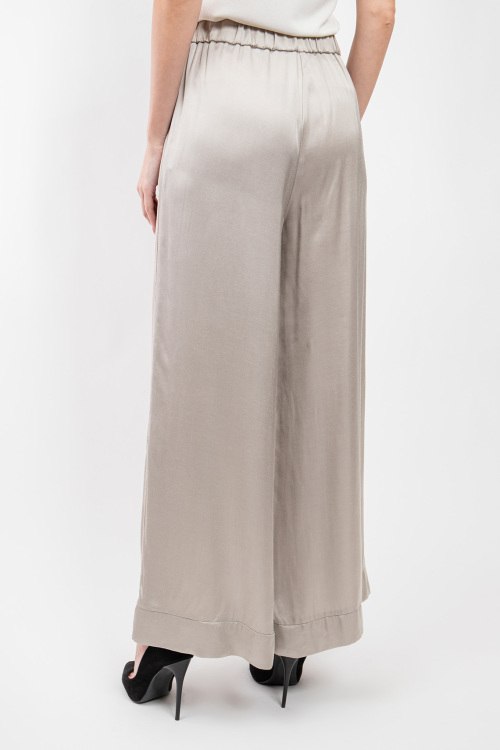 Женские светло-серые брюки-палаццо из вискозы от Atelier Emi (Ателье Эми). Эластичный пояс, боковые карманы, широкий крой, полная длина. Размер вещи на фото: M, длина: 105 см, ширина штанины вверху: 36 см, ширина по поясу: 37 см (резинка), ширина по бёдрам: 51 см, высота сидения: 39 см.