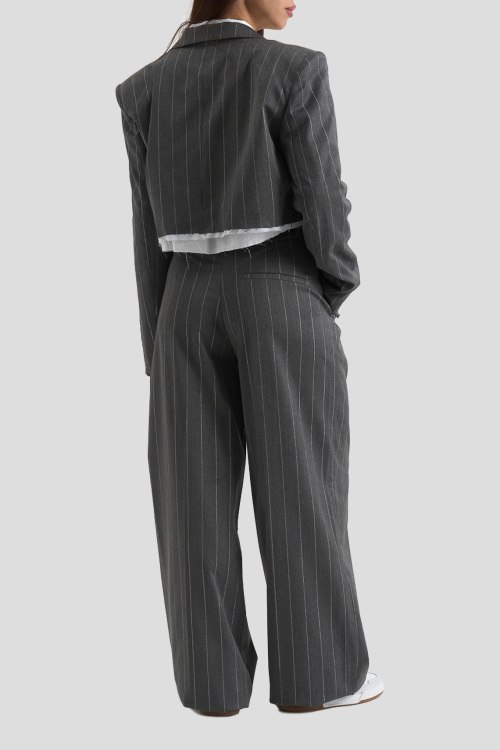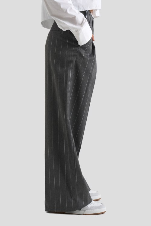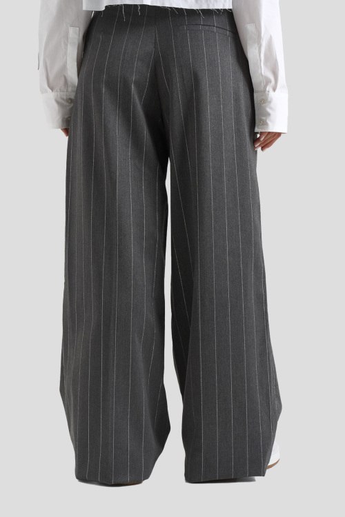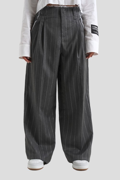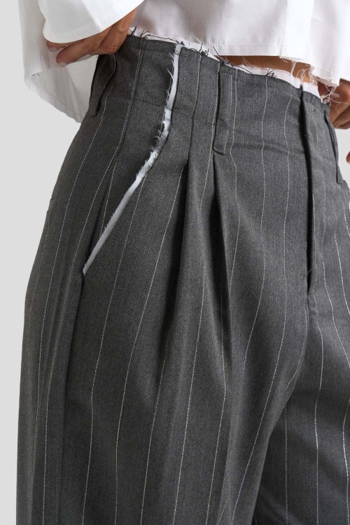 Детали: Женские серые брюки из полиэстера и вискозы от Comme des Fuckdown (Камм дес Факдаун). Высокая посадка, застежка на молнию и пуговицу, дизайн в полоску, классическая длина, прорезные карманы, петли в пояес для ремня