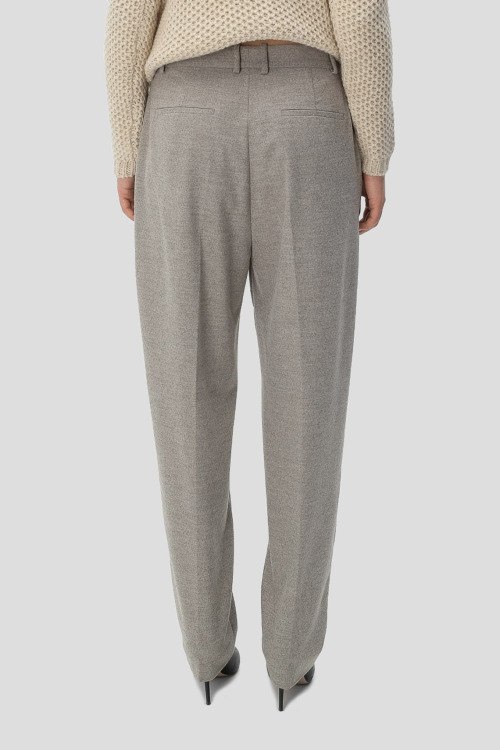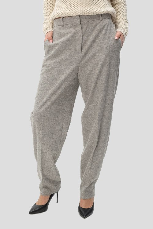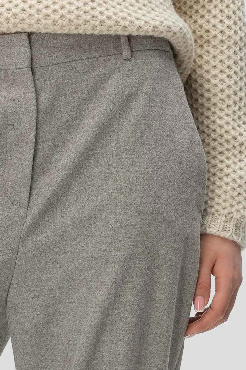 Детали: Женские серые брюки из шерстяного микса от Hugo Boss (Хуго Босс). Классическая длина, высокая посадка, застежка на молнию и крючки, прорезные карманы, петли в поясе для ремня, зауженная модель книзу