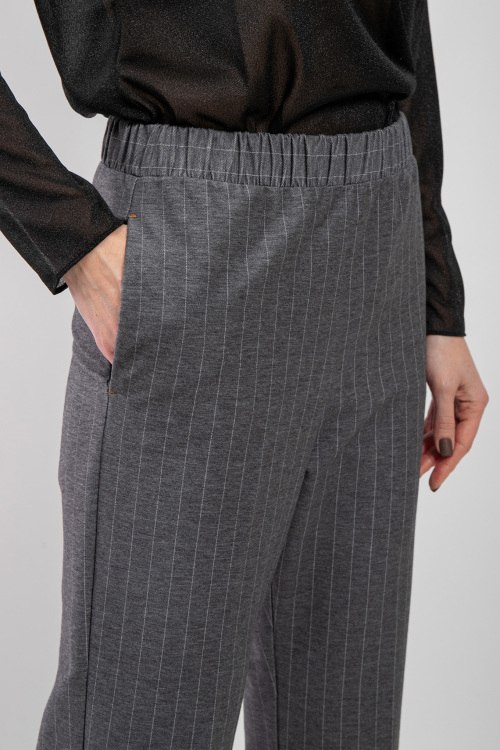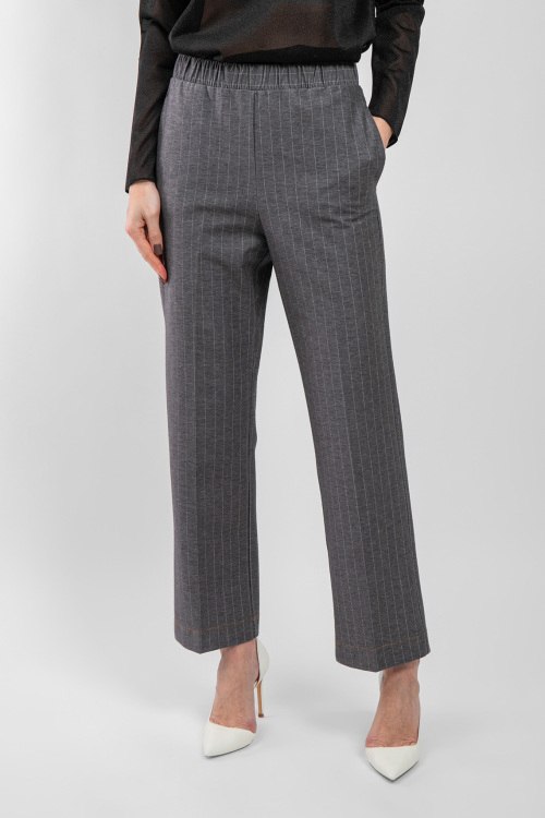 Женские серые хлопковые брюки Quiete от Max Mara Leisure (Макс Мара Лэжэ). Тонкая полоска по всей поверхности, эластичный пояс, боковые карманы, нашивка с логотипом сзади на поясе, полная длина.